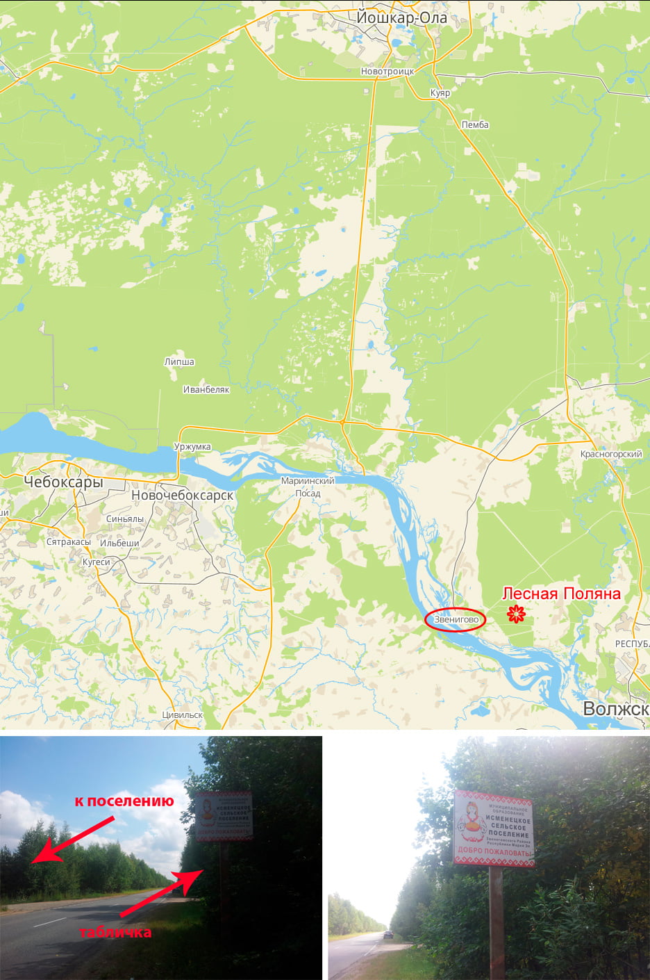 Ехать на Звенигово. На объездной Звенигово у указателя на Помары ехать на Помары. Через 9 км у таблички "Исменецкое сельское поселение" повернуть налево на грунтовку, через 1 км Лесная Поляна.